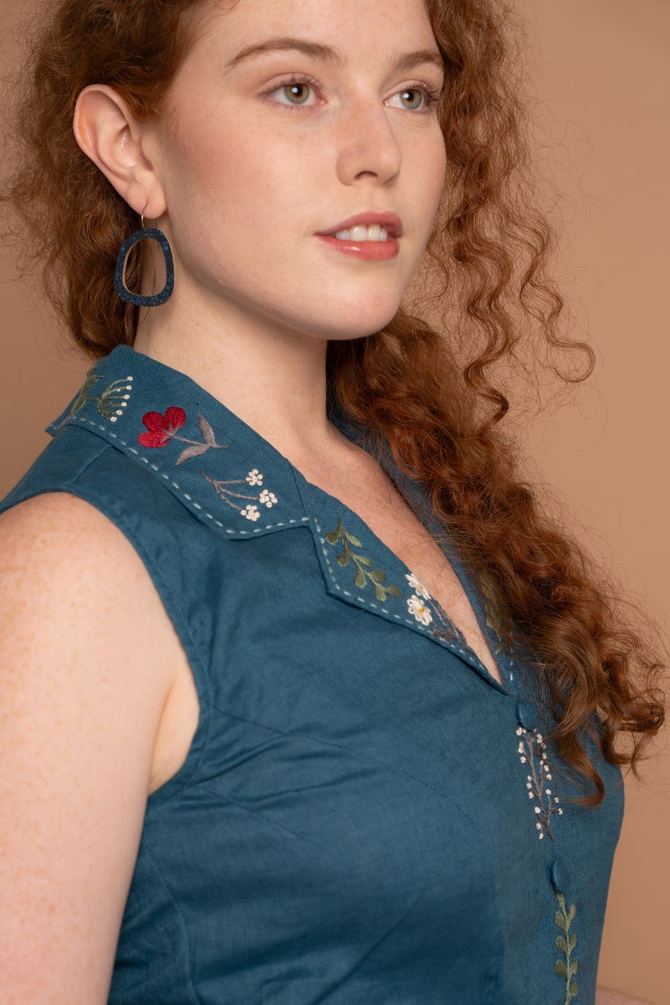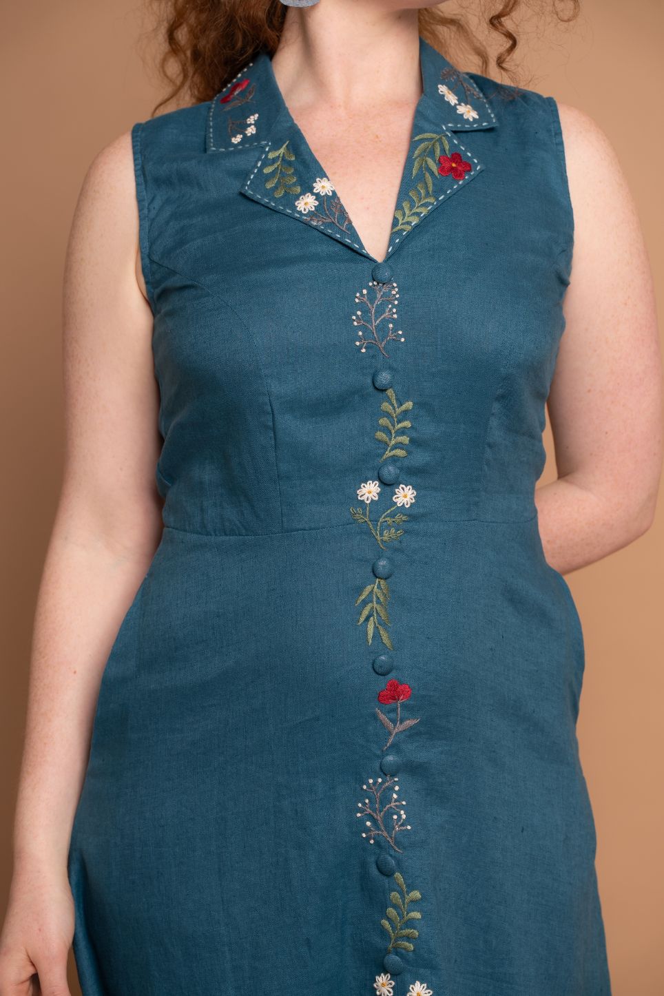Beautiful hand- embroidered floral on teal linen