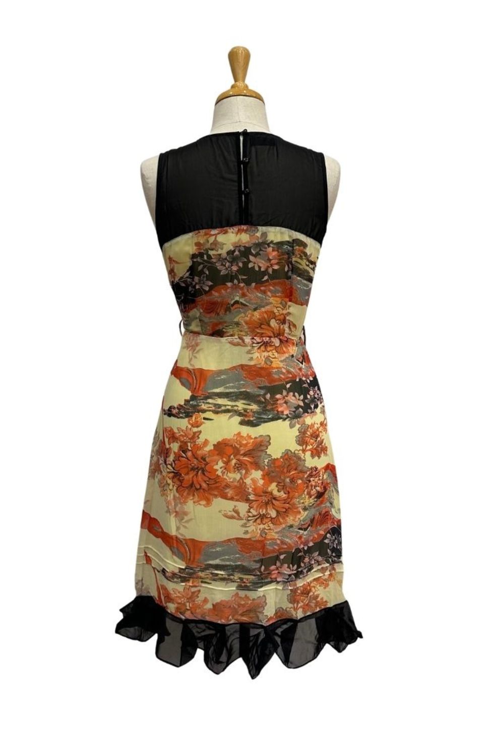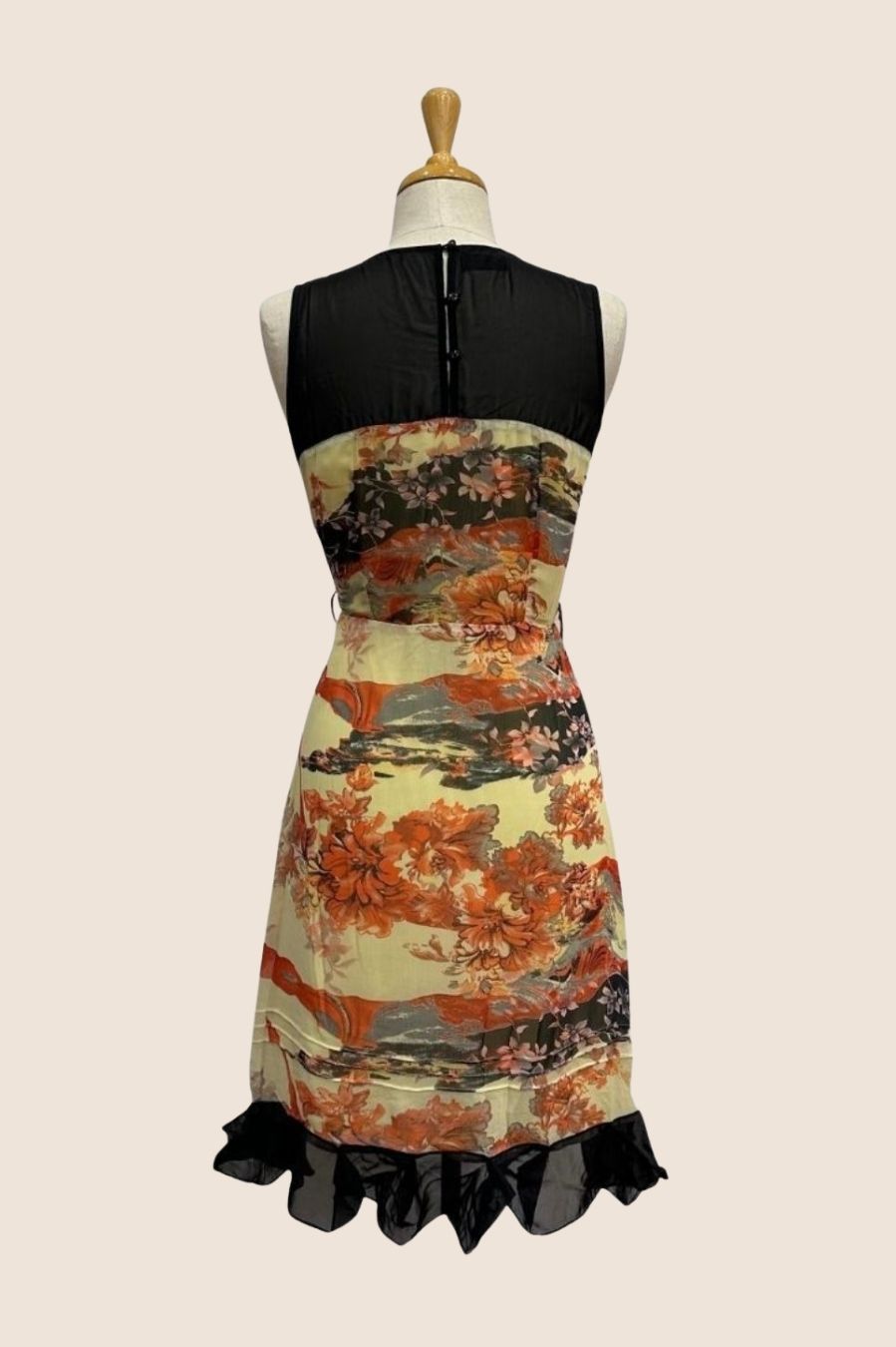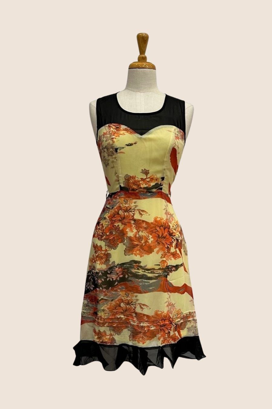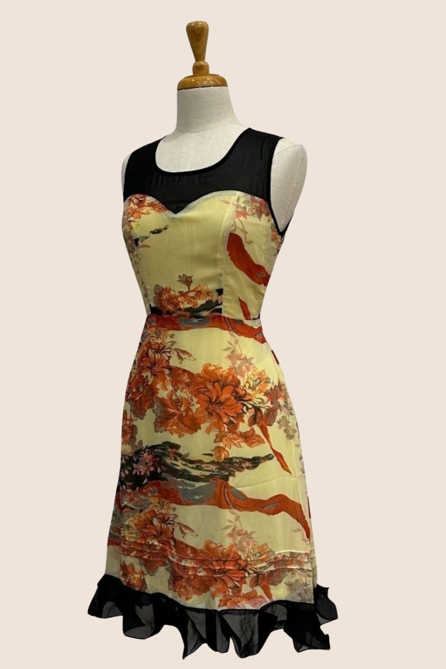 Butter cream colour floral with black sheer contrast upper bodice & hem