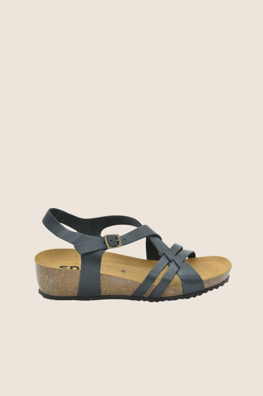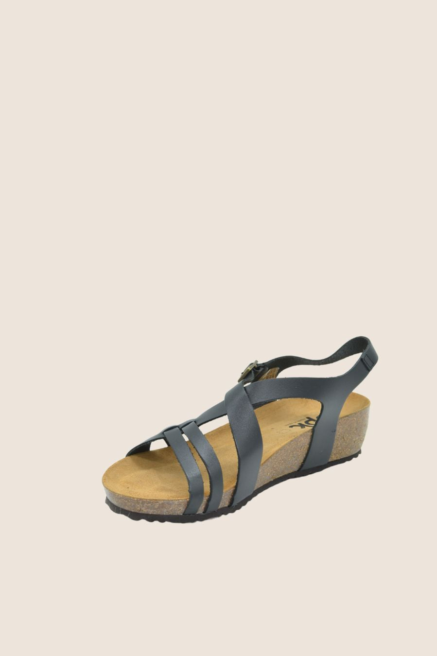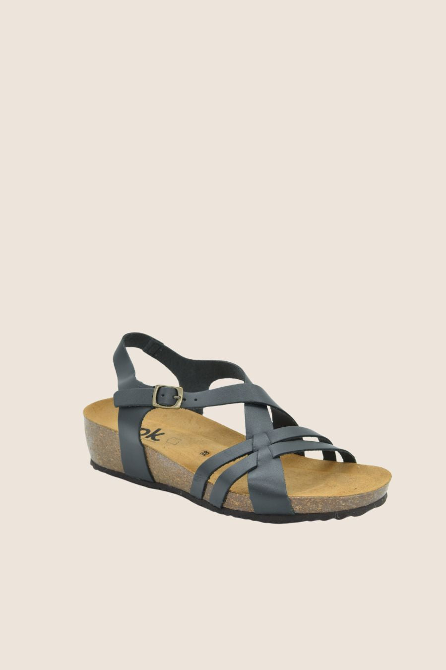 Sandal features cross-over straps on the vamp and a wrap-around ankle strap with adjustable buckle fastening.