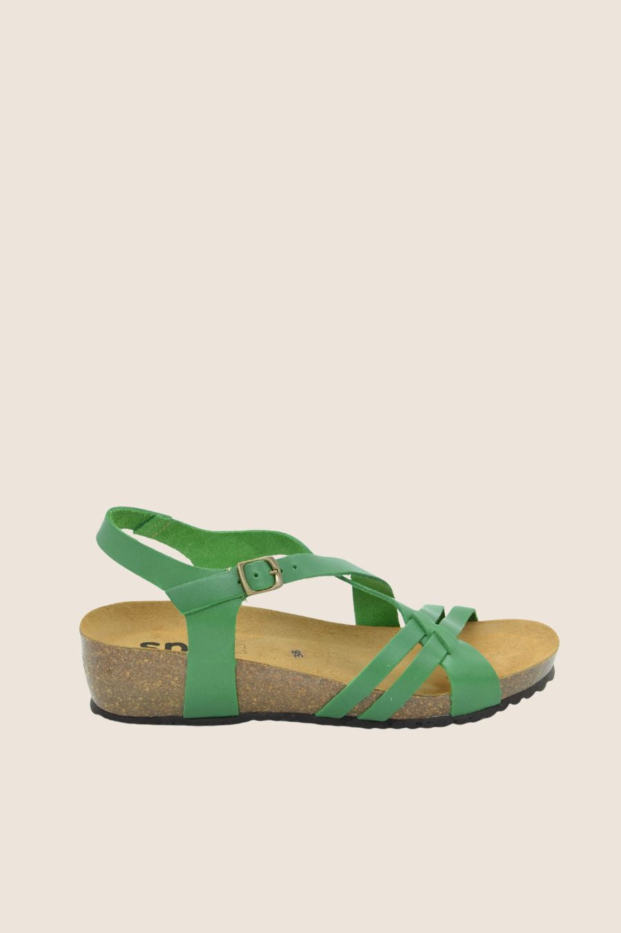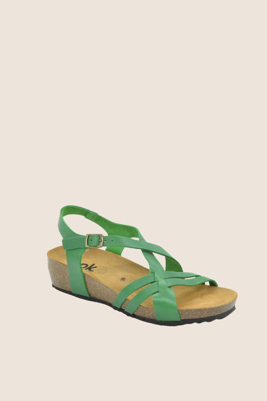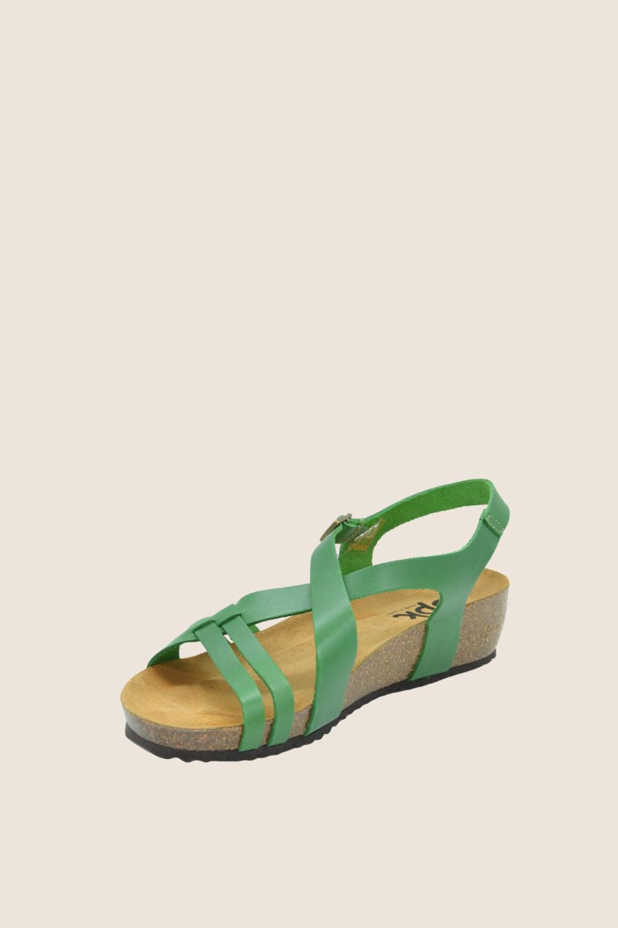 Sandal features cross-over straps on the vamp and a wrap-around ankle strap with adjustable buckle fastening.